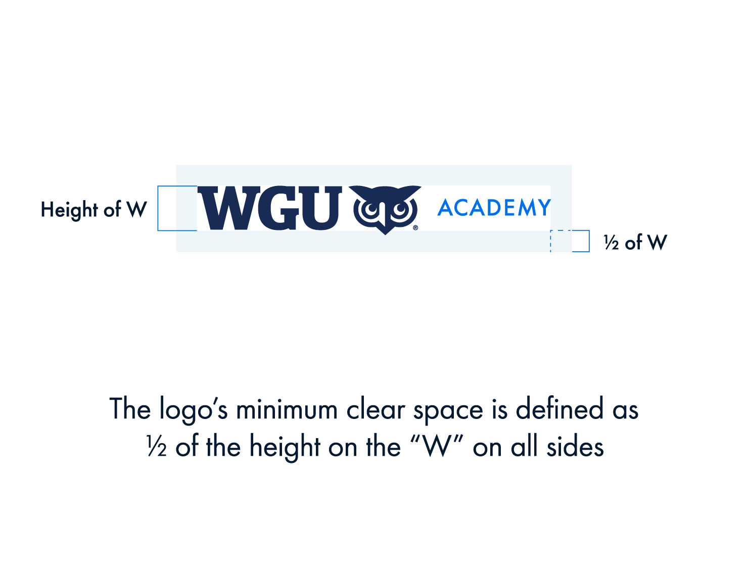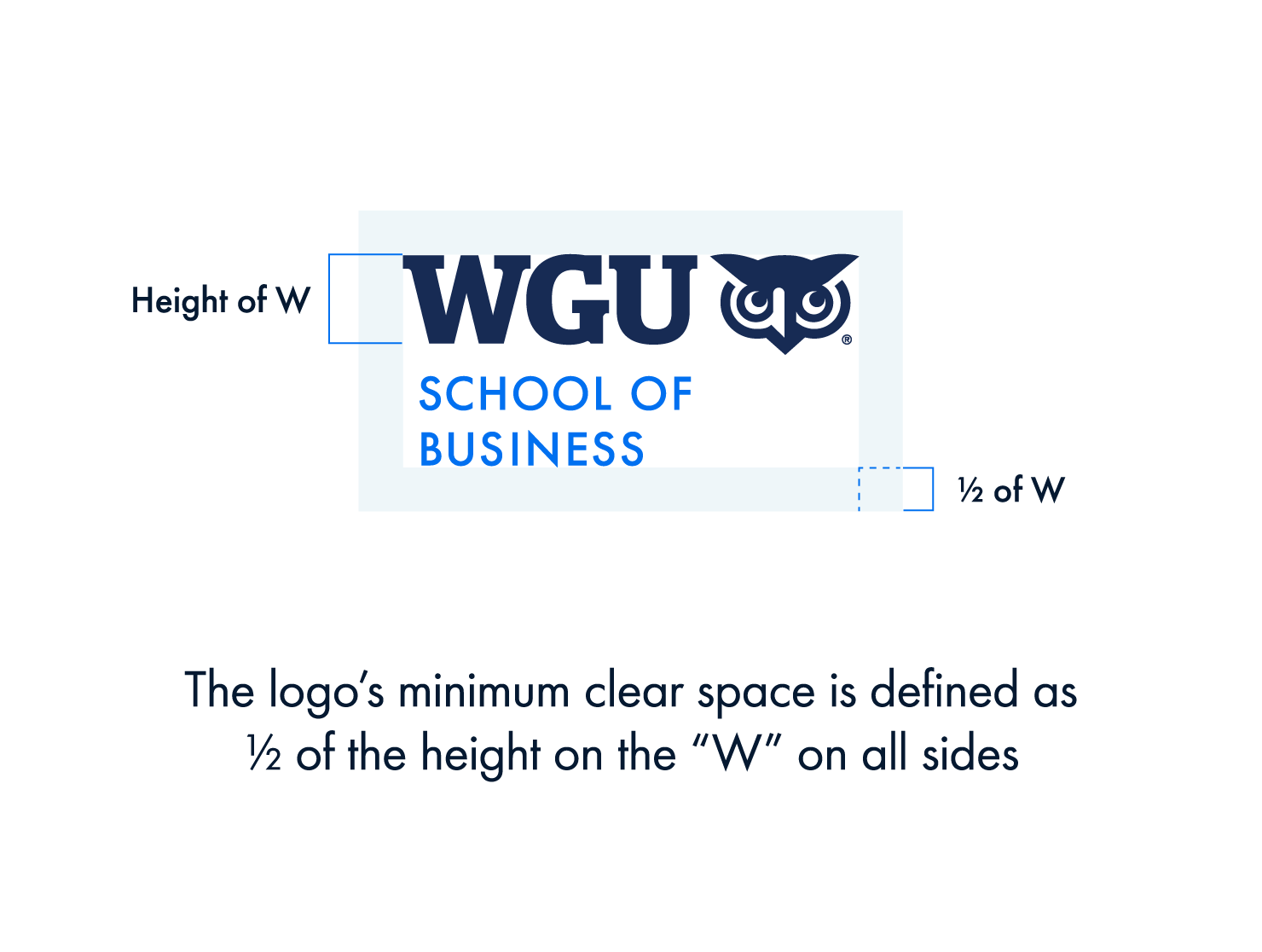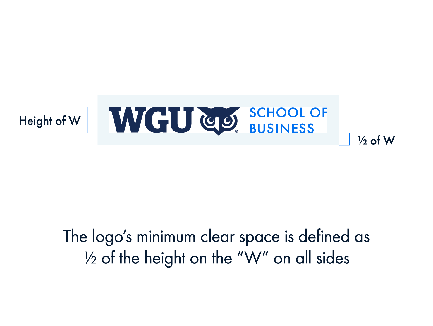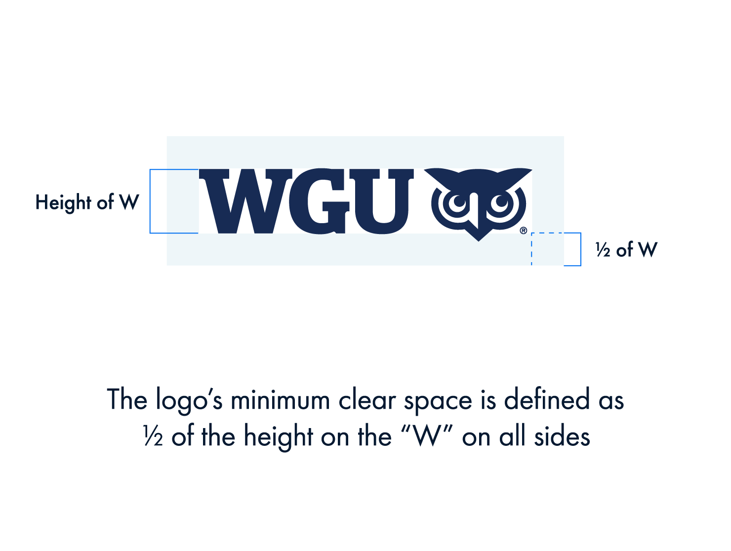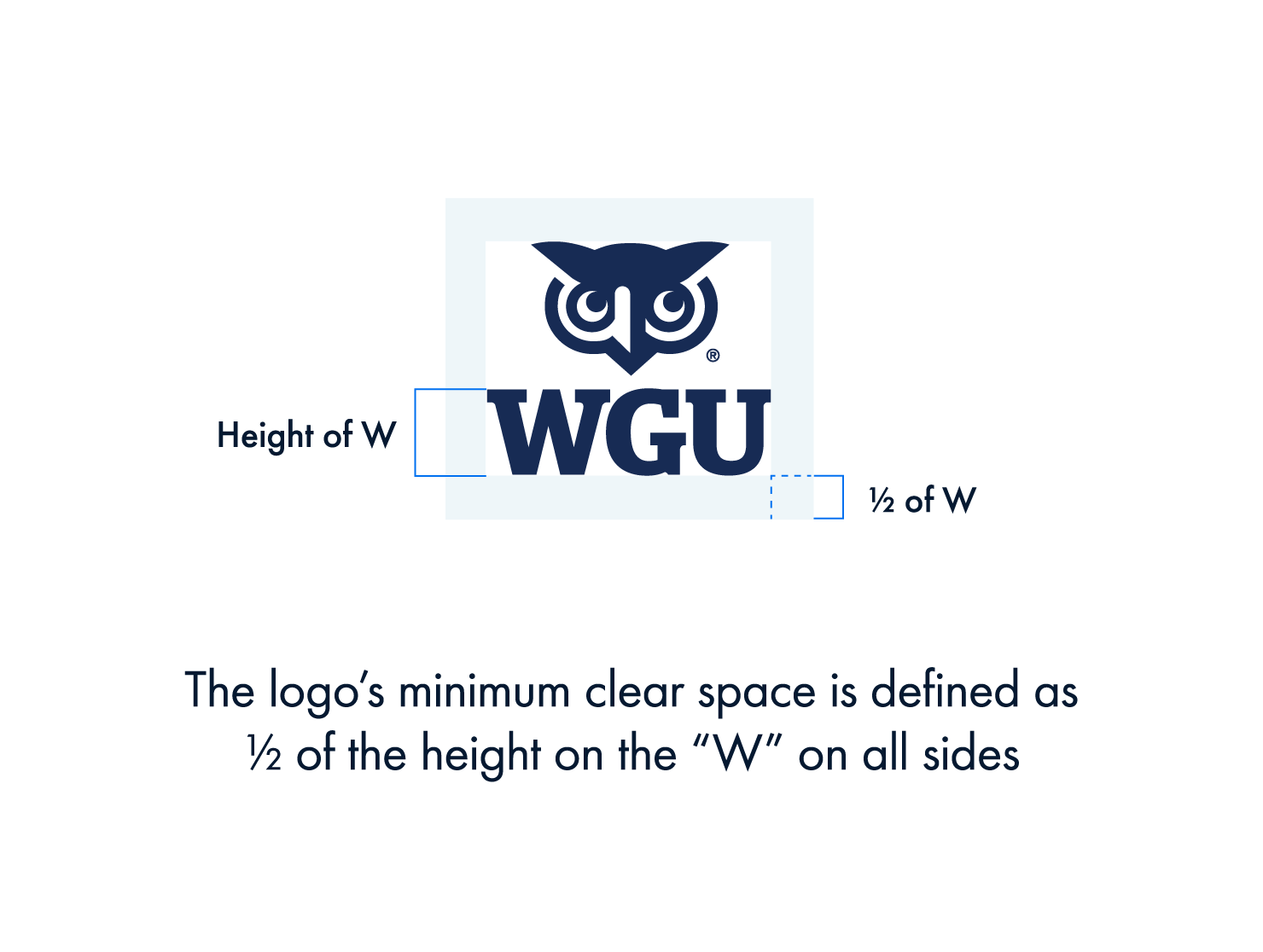 To protect the integrity and readability of our logo, you must leave the required minimum (or greater) clear space around the logo or lockup on all four sides. That minimum clear space is defined as half the X-height of the WGU master brand mark. There are no exceptions to this requirement.